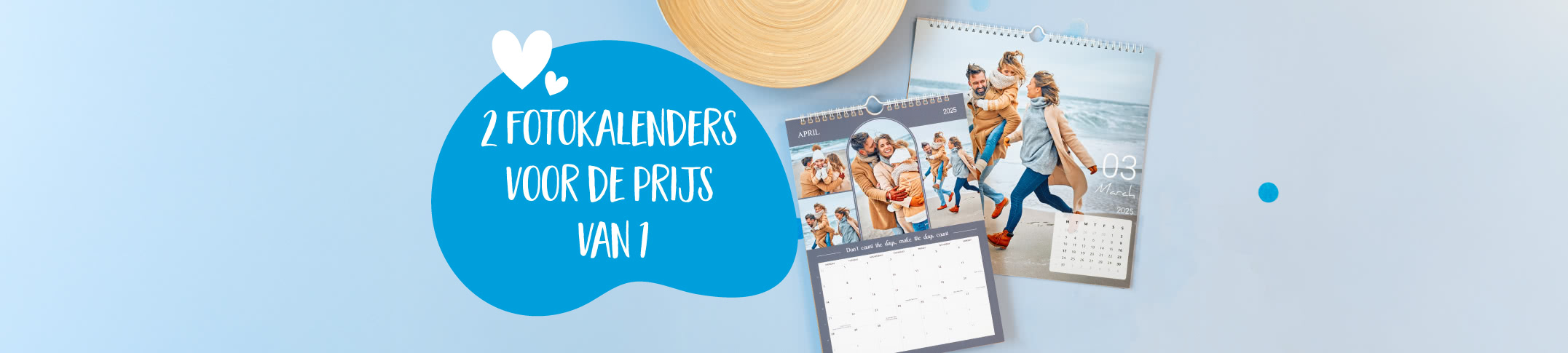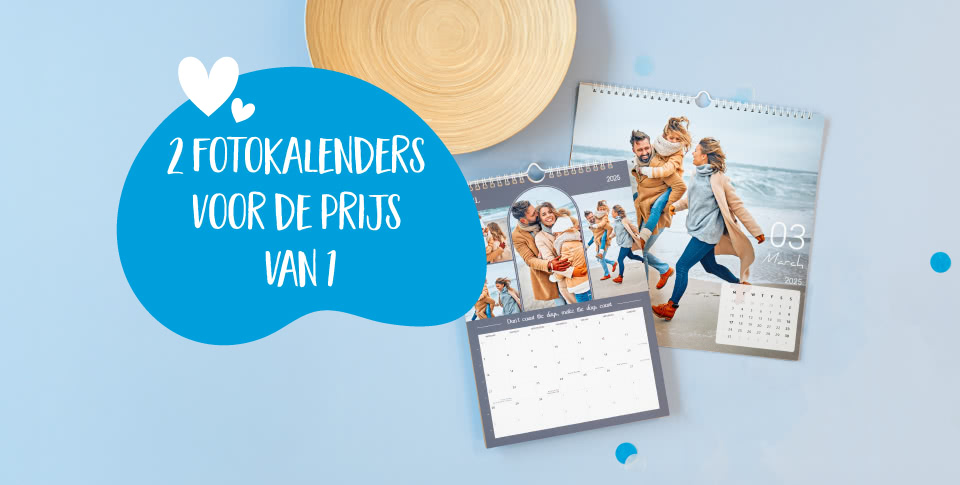 * Aanbod geldig t.e.m. 19/10/2025 op één bestelling van een bon voor 2 bureaukalenders liggend met spiraalbinding, 2 wandkalenders A4 of 2 wandkalenders A3 staand/liggend via www.smartphoto.be. Niet cumuleerbaar met andere promoties. Verzendkosten niet inbegrepen. Niet omruilbaar in speciën. Je kan de actiecode slechts éénmaal gebruiken dus je moet de 2 kalenders samen bestellen. Eén bon per persoon.